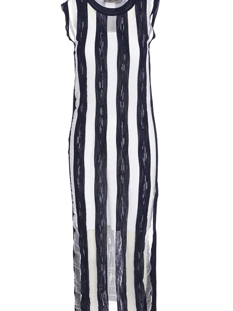 Детали: облегающий крой, круглый вырез горловины, полупрозрачная фактура, полоски с прорехами, нижнее платье-футляр. Длина миди.