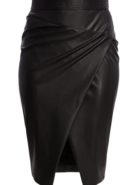 Детали: облегающий крой с драпировкой и нахлёстом, высокая посадка, длина ниже колена.