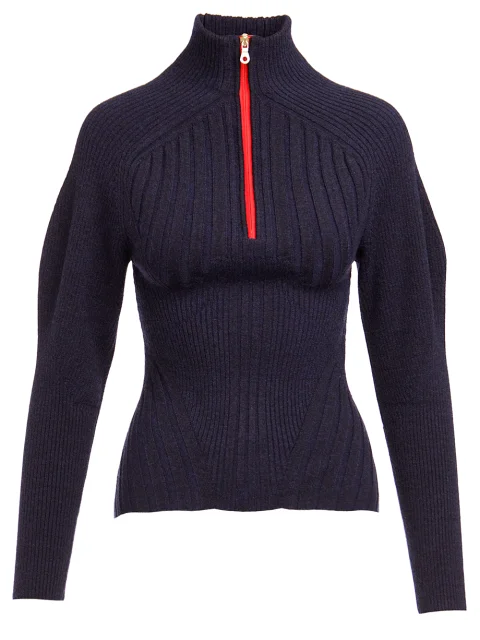 Детали: приталенный крой, высокий ворот с контрастной молнией, объёмный фигурный рукав, вязка в рубчик.