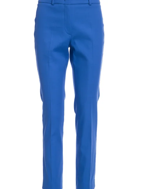 Детали: прямой крой, зауженный книзу, высокая посадка, два прорезных с рантом кармана сзади, стрелки вдоль штанин, длина по щиколотку. Пояс со шлевками для ремня, потайной крючок, ширинка.