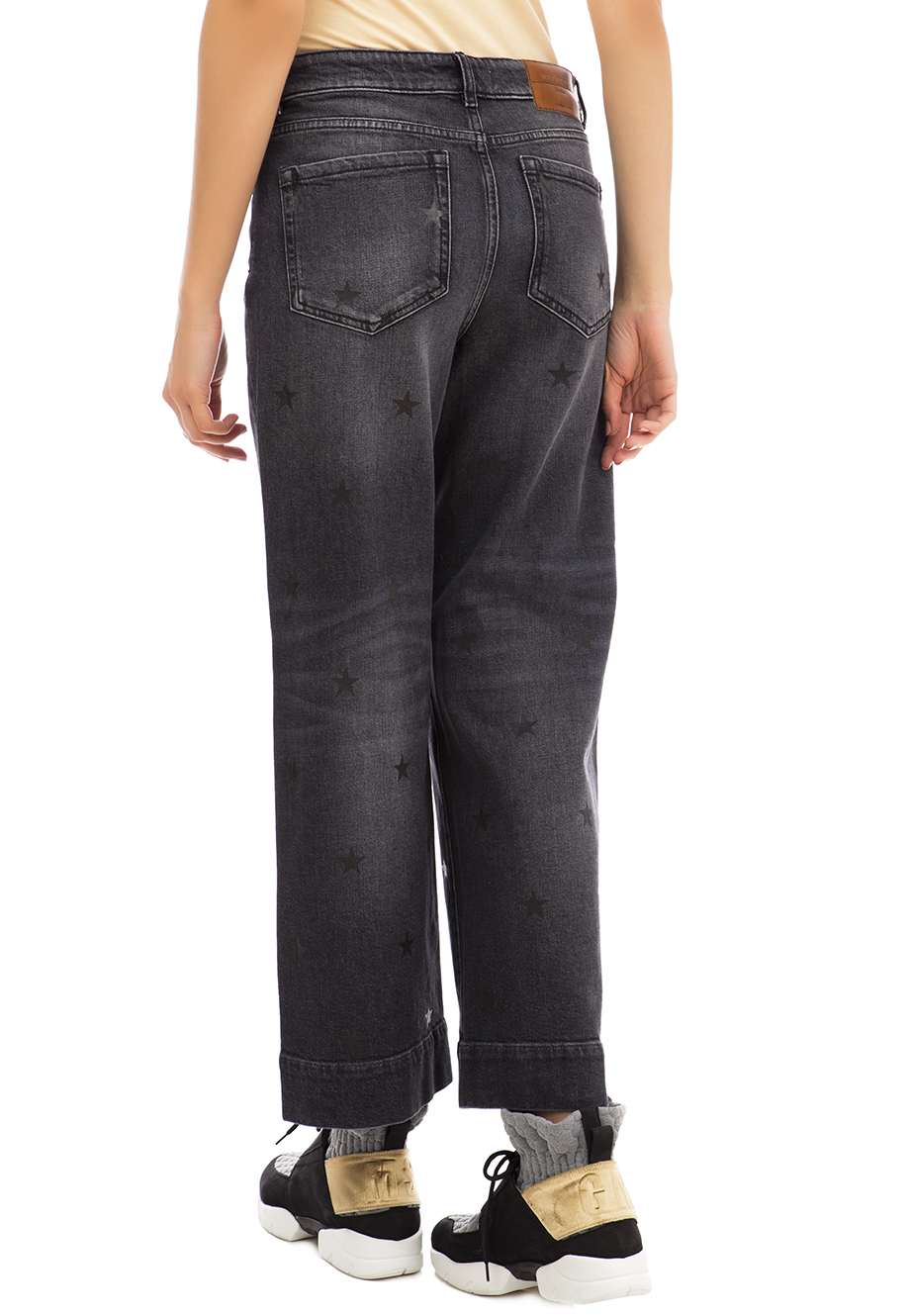 Детали: прямой свободный от бедра крой, средняя посадка, пять традиционных карманов, длина до щиколоток, широкий подгиб по нижнему краю, печатная аппликация в звёзды.