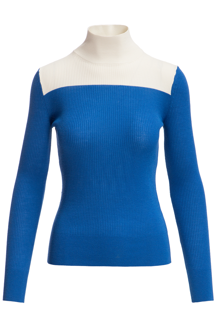 Детали: облегающий крой, высокий ворот, длинный втачной рукав, комбинация двух цветов, фактурная вязка резинкой.