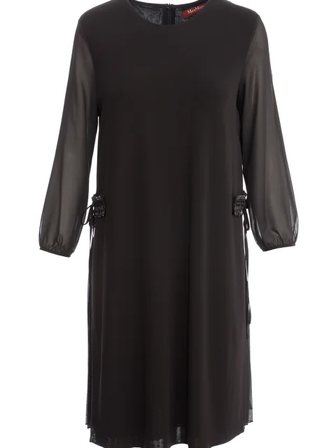 Детали: прямой крой, круглый вырез горловины, втачной рукав длиной 7/8, собранный тонкой манжетой. По бокам декоративные нашивки из бисера и кристаллов. Застёгивается потайной молнией на спинке, длина до колена.