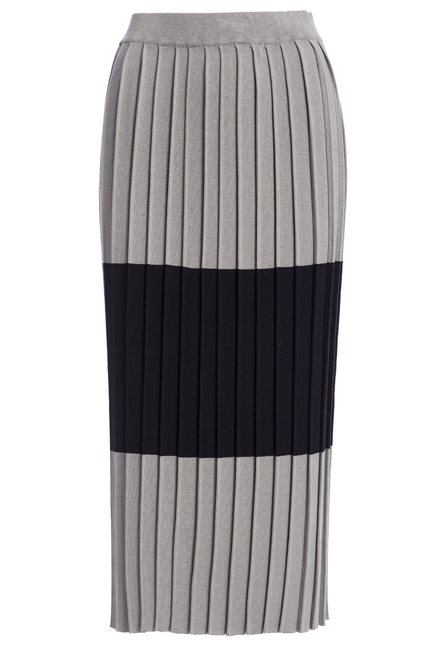 Детали: высокая посадка, эластичный пояс, широкая контрастная полоса, длина миди.