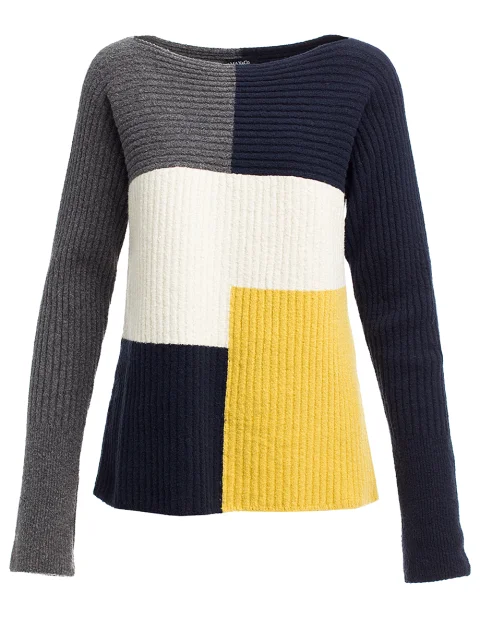 Детали: прямой крой, вырез горловины лодочкой, цельнокроеный длинный рукав, вязка резинкой, цветовые блоки.