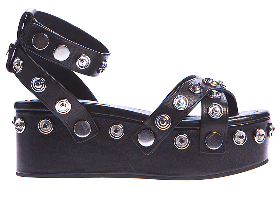 Босоножки из натуральной кожи с ремешками и перемычками обильно декорированными металлической фурнитурой. Кожаная стелька «с памятью» для максимального комфорта. Платформа обтянута кожей, высота 6,5 см. В комплекте прилагается чехол для хранения.