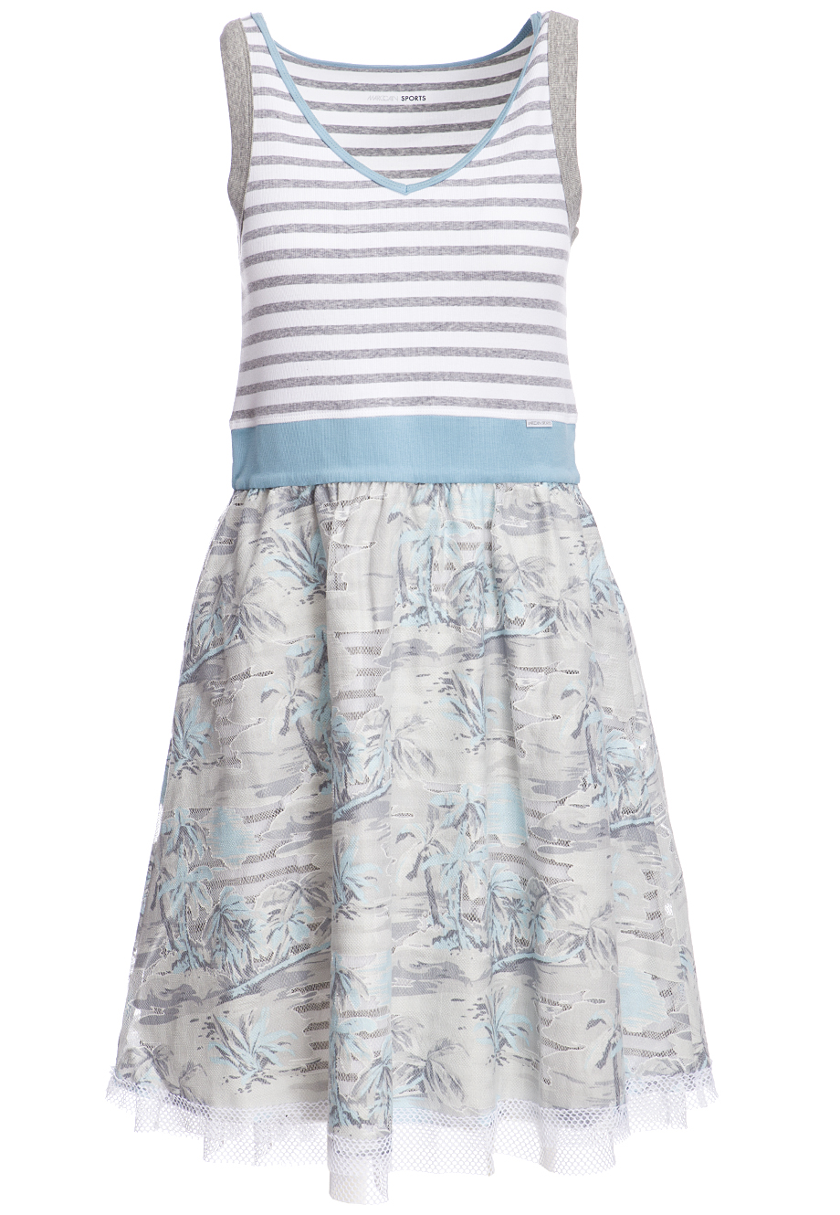 Детали: А-силуэт, отрезная линия талии, круглая форма декольте, топ из джерси в полоску, юбка с цветной вышивкой.