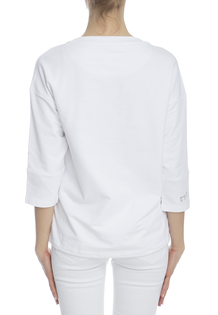 Детали: прямой свободный крой, круглый вырез горловины, спущенный рукав длиной ¾, аппликации на передней части.