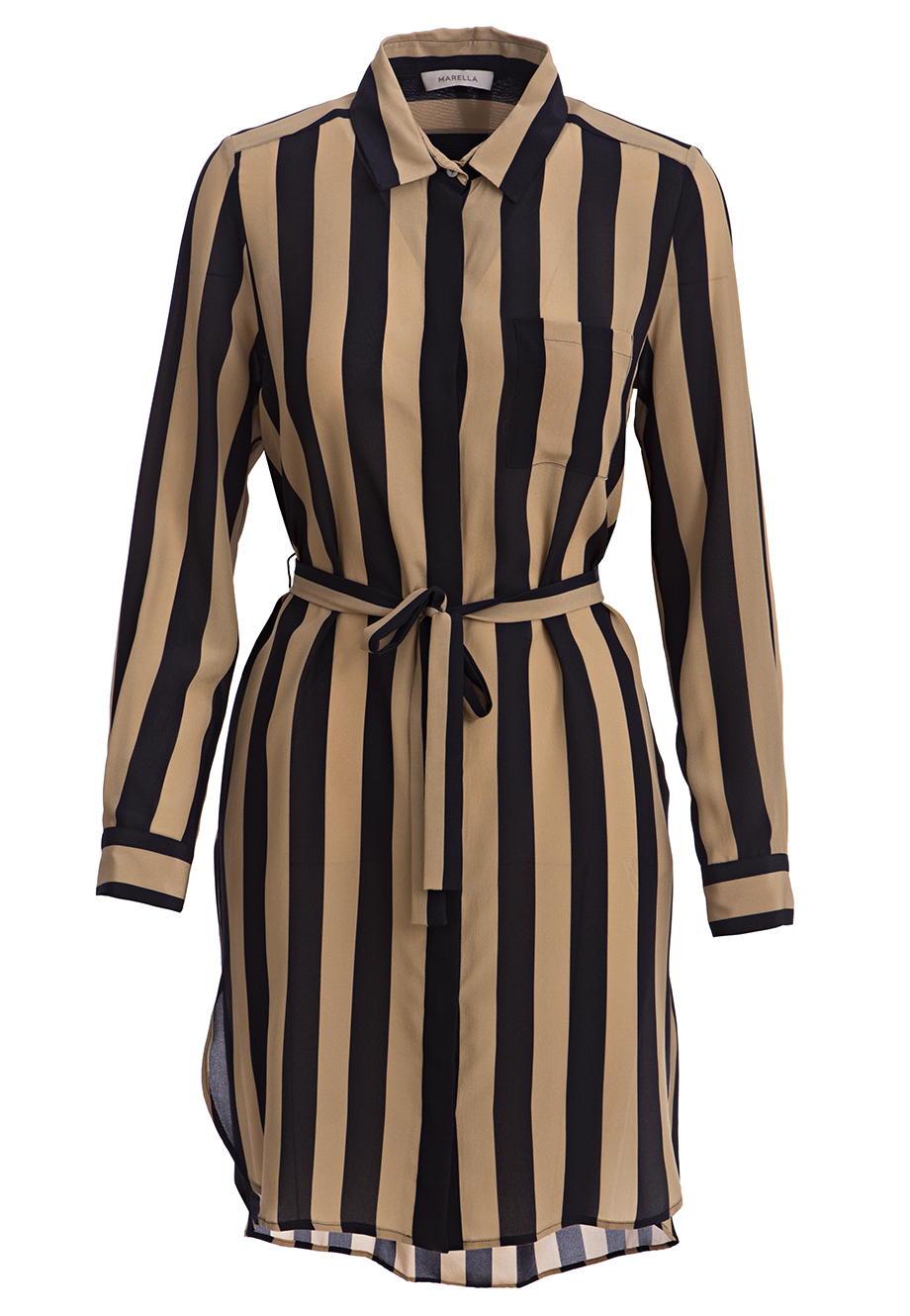 Детали: прямой крой, отложной воротник, длинный втачной рукав, собранный манжетой на пуговице, ассиметричная длина, боковые разрезы, накладной карман на груди, планка с рядом скрытых пуговиц, пояс по линии талии.