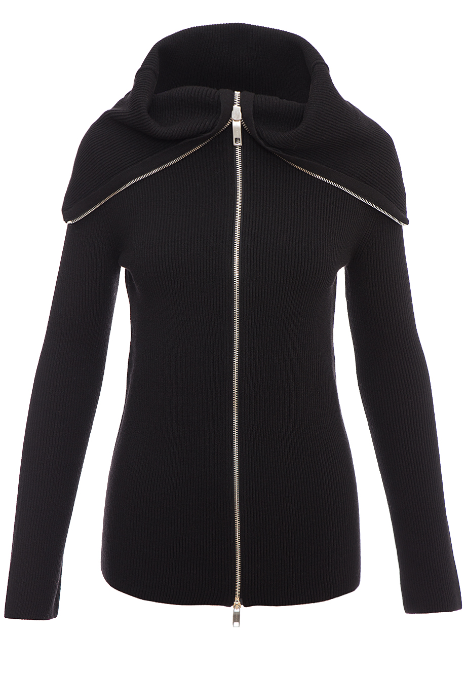 Детали: облегающий крой, длинный втачной рукав, высокий ворот с большим отворотом. Застёгивается металлической молнией, фактура вязки в рубчик.