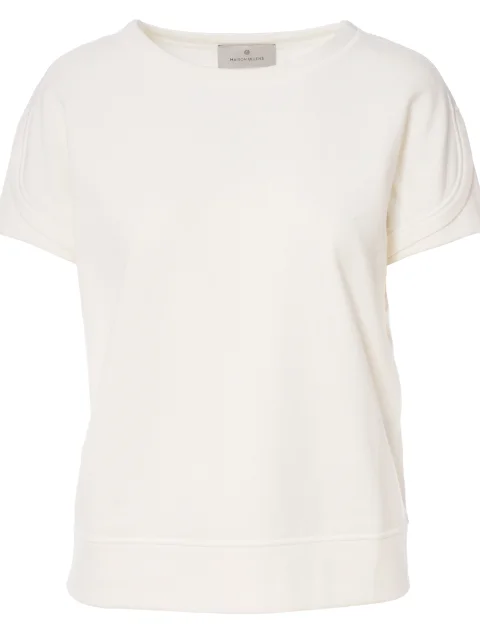 Детали: прямой крой, трикотаж плотного плетения, круглый вырез горловины, двойной короткий рукав, широкий подгиб по нижнему краю.