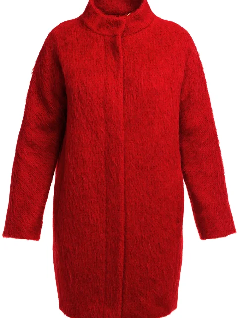 Детали: крой-кокон, ворот стойка, цельнокроеный длинный рукав, прорезные карманы по боковым швам, длинный ворс полотна, застёгивается скрытым рядом пуговиц.