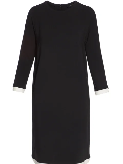 Детали: прямой крой, круглый вырез горловины, длинный втачной рукав, прорезные карманы по боковым швам, контрастная кромка по подолу и краю рукава.