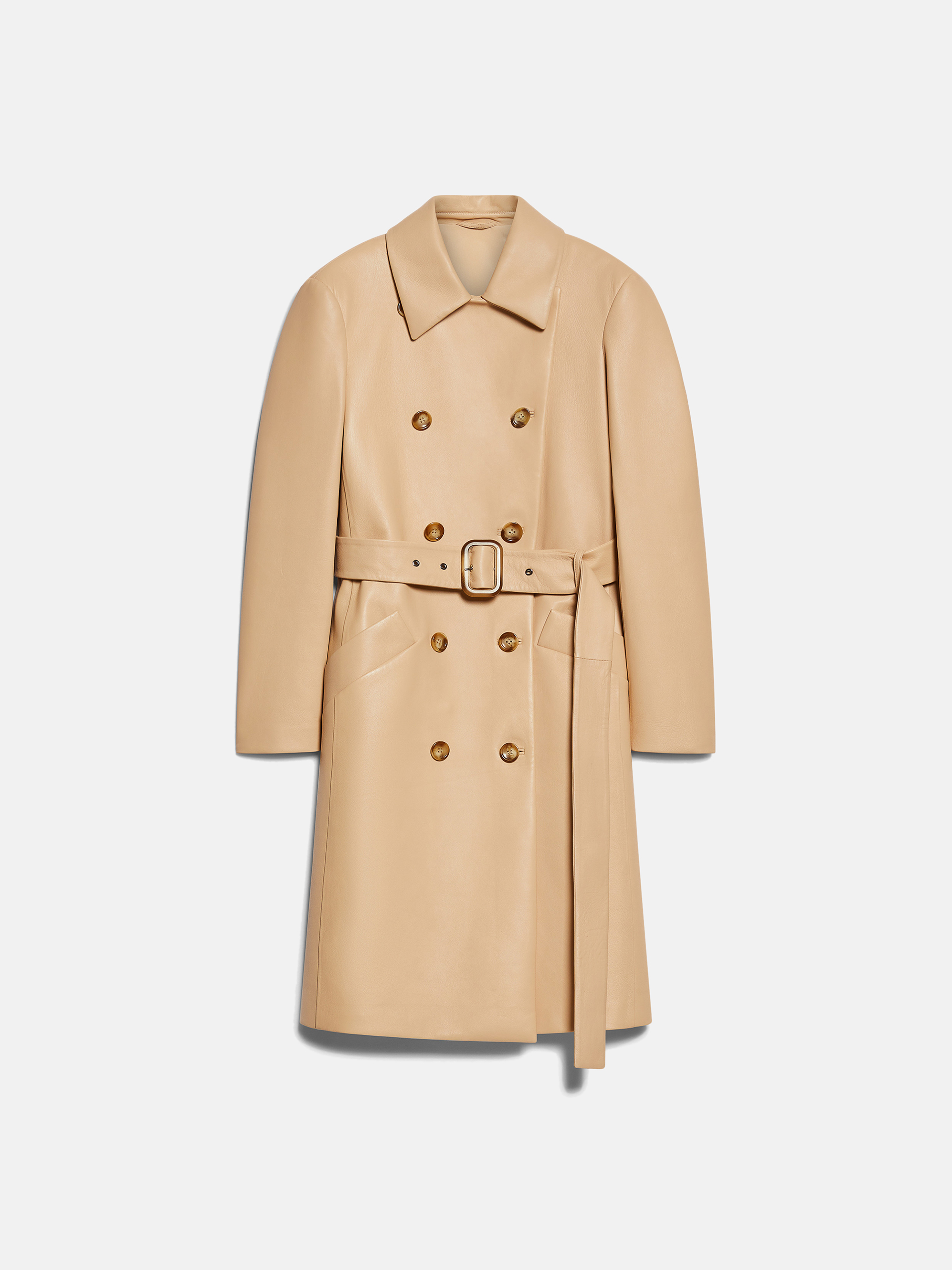 Плащ из мягкой кожи Двубортный Пояс, подчеркивающий талию Полуподложка Рубашечный воротник Боковые карманы с клапанами Центральный разрез сзади Параметры модели: рост 176 см, талия 58 см, бедра 87 см Цвет: кремовый