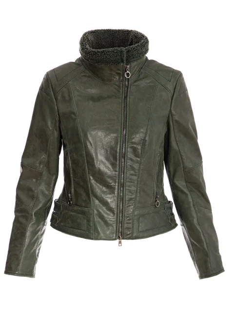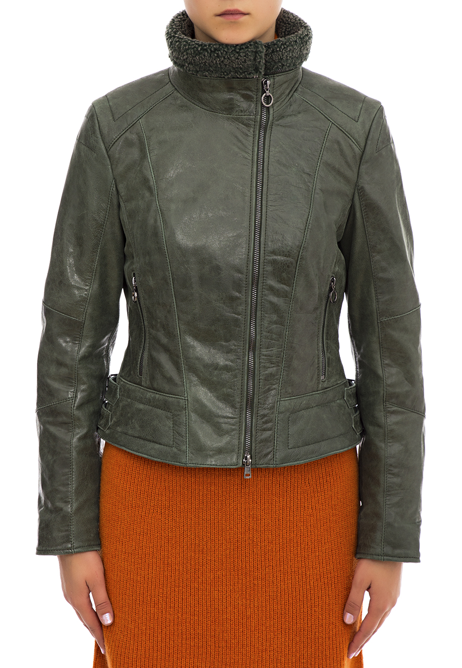 Детали: приталенный крой, высокий ворот с меховой отделкой, длинный втачной рукав, прорезные карманы на молниях по бокам, хлястики с пряжками по нижнему краю, отделка швов, эффект винтажности на коже.