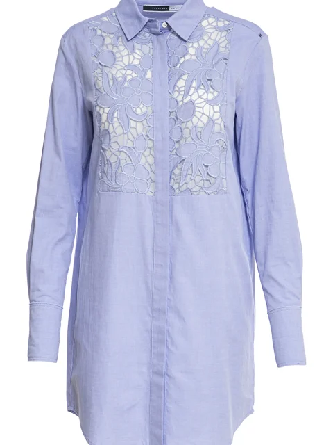 Детали: прямой крой, длина выше колена, длинный втачной рукав, собранный манжетой на пуговице, отложной воротник. Кокетка на груди украшена прошвой. Закруглённый подол, кокетка с потайным рядом пуговиц.