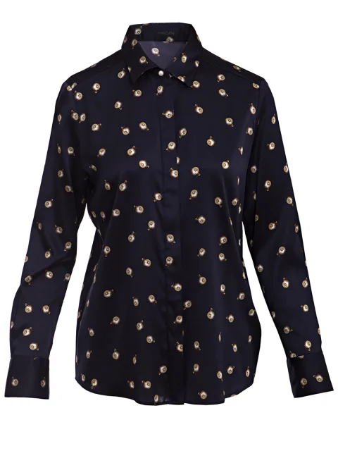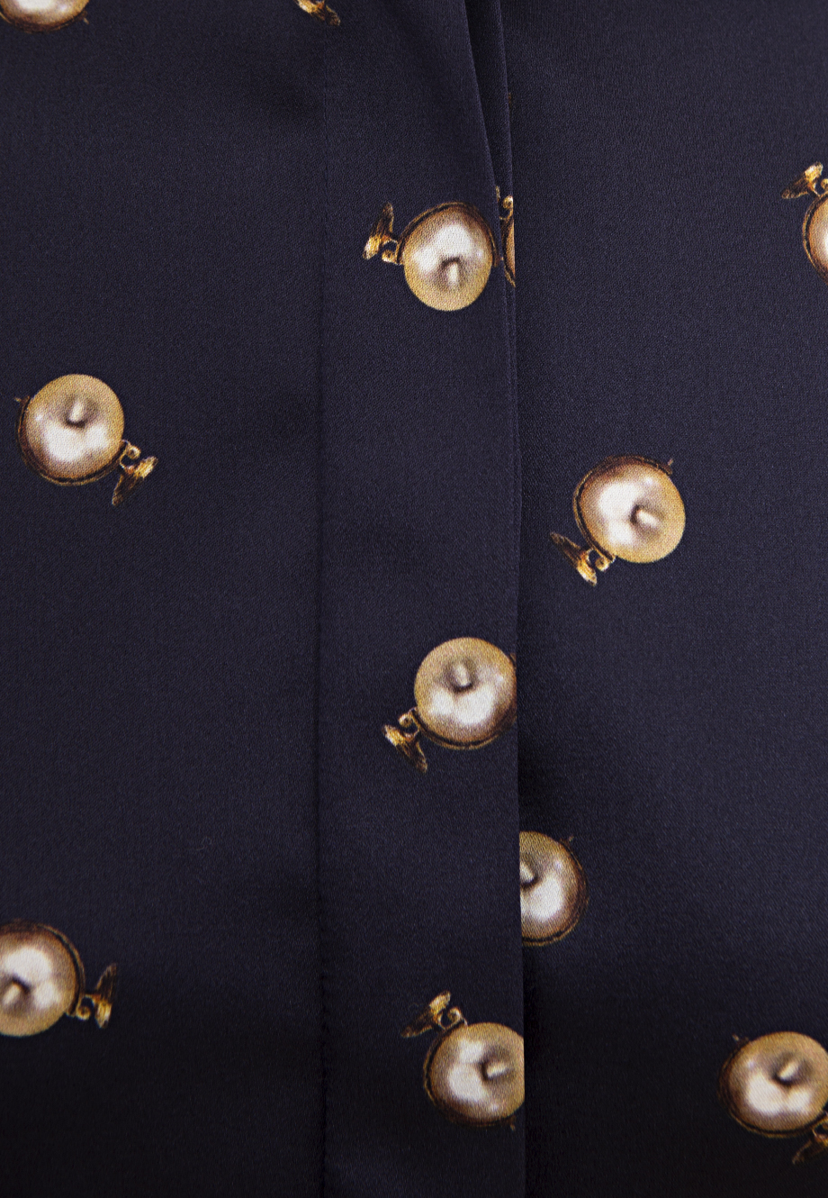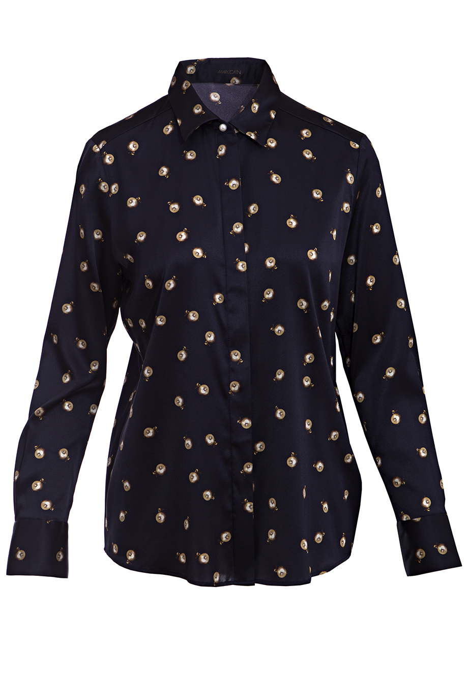 Детали: прямой крой, отложной воротник, длинный втачной рукав с манжетой на пуговице- бусине, пуговица на вороте в виде жемчужины, планка с рядом скрытых пуговиц. Жемчужный принт.