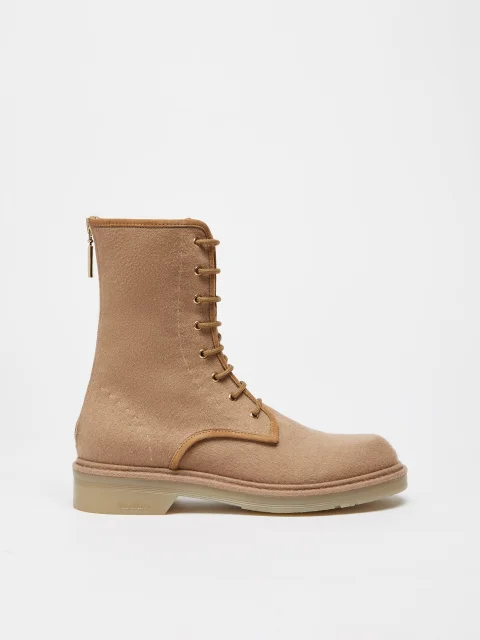 Ботинки из чистого кашемирового драпа с замшевыми деталями Боковой логотип бренда на пятке На шнуровке Сзади застежка на молнию Полупрозрачная резиновая подошва с логотипом Подошва с нескользким покрытием Цвет: темно-бежевый