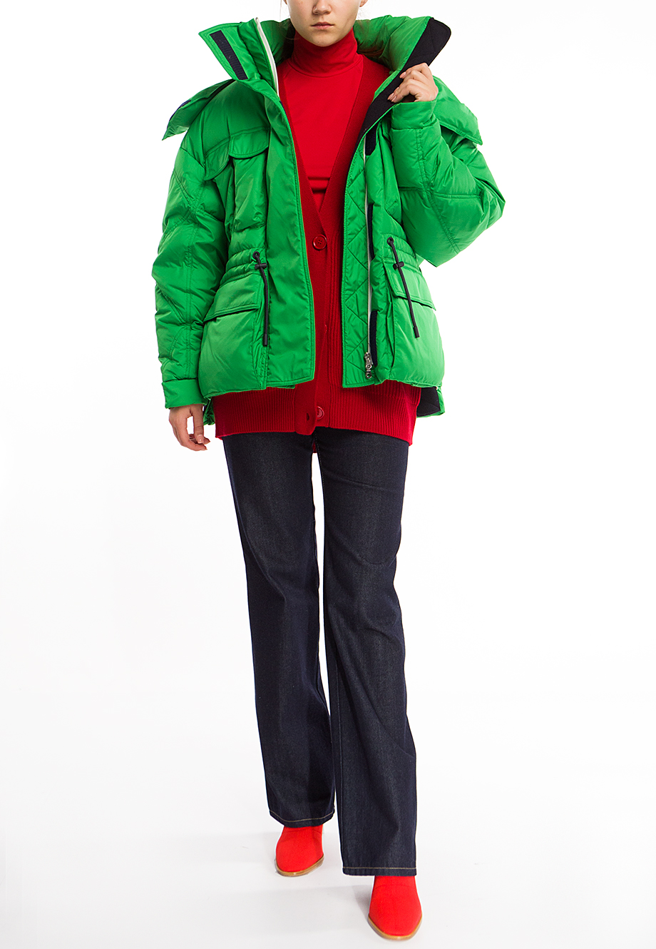 Детали: овальный крой, V-образный мыс, длинный рукав реглан, манжеты по нижнему краю и на рукавах, вязка резинкой, застёгивается пуговицами.