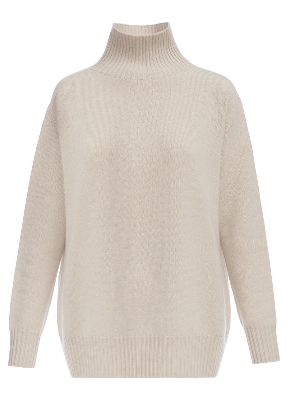Детали: прямой свободный крой, высокий ворот, спущенный длинный рукав, гладкая вязка, резинка по нижнему краю и на рукавах.