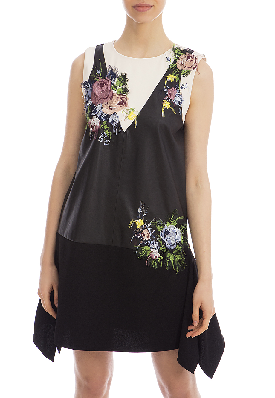 Детали: А-силуэт, круглый вырез горловины, имитация сарафана на светлом топе, цветочная вышивка, верхняя часть из искусственной кожи, ассиметричная длина. Застегивается потайной молнией на спинке.