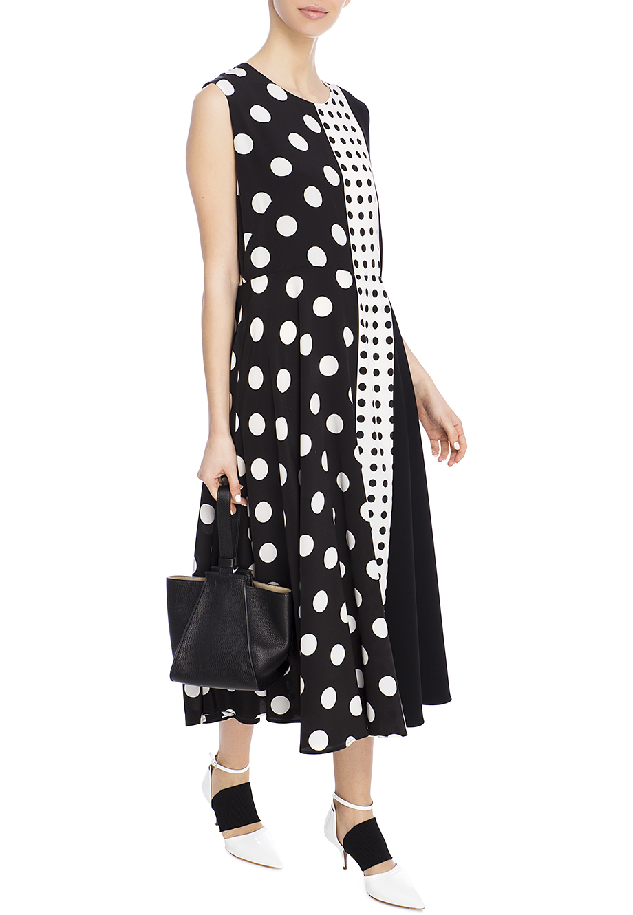 Детали: А-силуэт, круглый горловины, без рукавов, отрезная линия талии, длина миди. Комбинация нескольких материалов с разным принтом.