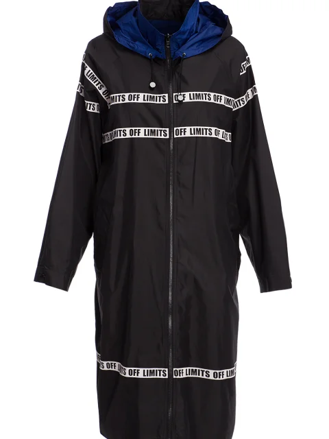 Детали: прямой свободный крой, ворот с капюшоном, широкий длинный рукав реглан, прорезные боковые карманы с рантом. Одна сторона - матовая чёрного цвета с печатной полосой, вторая - глянцевая синяя. Застёгивается молнией.
