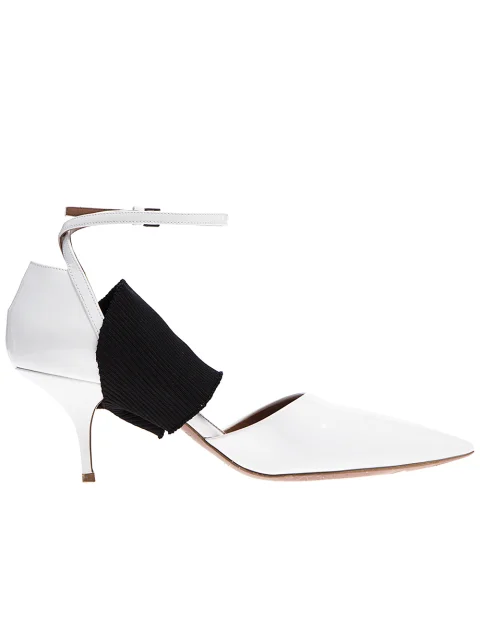 Детали: заострённый носок, закрытая пятка с ремешком вокруг щиколотки, каблук высотой 6 см. Контрастная трикотажная перепонка на подъёме.