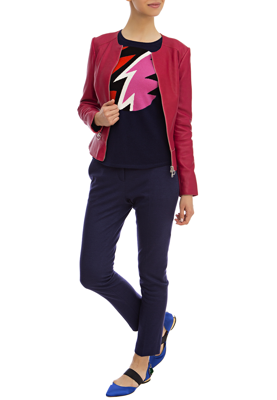 Детали: традиционный укороченный крой, высокая посадка, французские боковые карманы, сзади два прорезных с рантом, пояс с потайным крючком, ширинка.