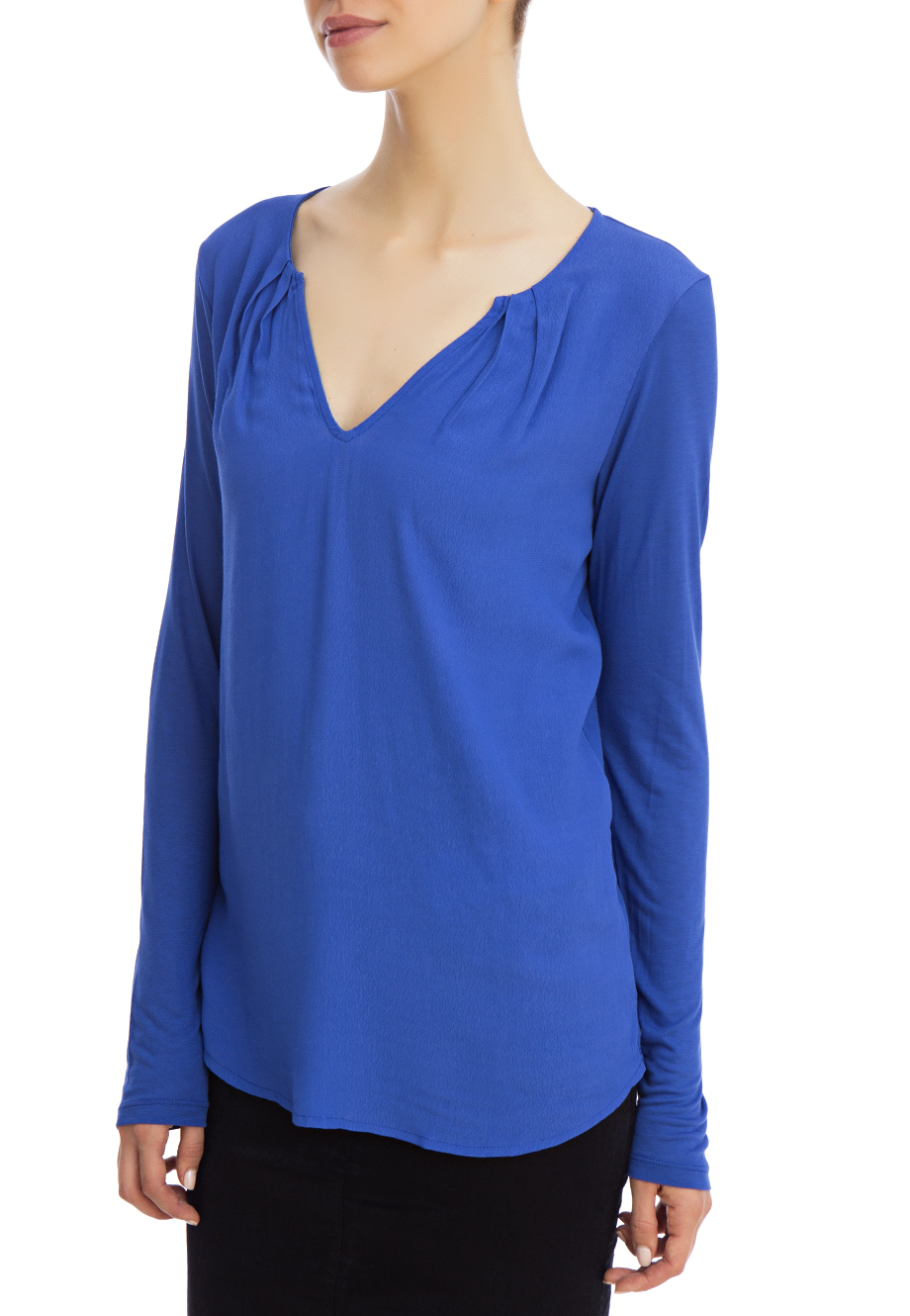 Детали: прямой крой, круглый вырез горловины с мысом, длинный втачной рукав и спинка из джерси, передняя полочка из крепдешина.