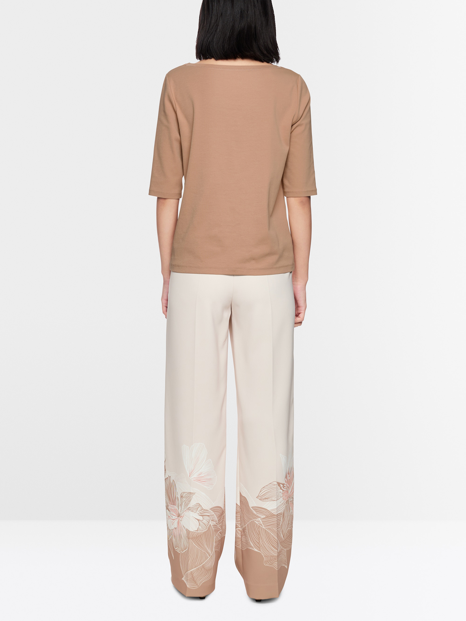 Эта футболка с коротким рукавом выполнена из смеси хлопка и эластана и имеет высокий круглый воротник с плоской отделкой. Декоративная лента у горловины служит ненавязчивым акцентом. Модель приятна на ощупь, слегка тянется и идеально подходит для элегантного повседневного стиля.
