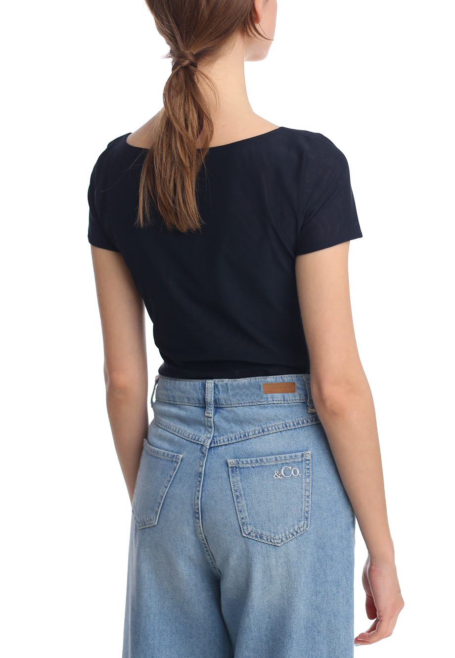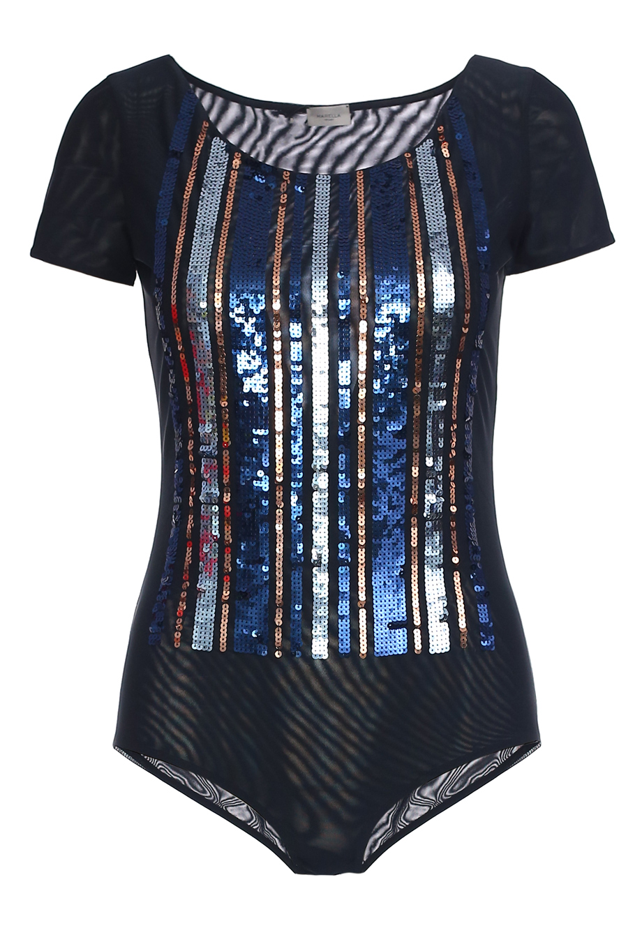 Детали: облегающий крой, круглая линия декольте, короткий рукав, аппликация пайетками, два слоя материала.
