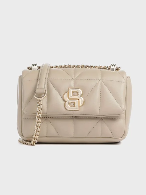 Бежевая сумка через плечо BOSS из искусственной кожи с магнитной застёжкой, регулируемым ремнём и удобным внутренним карманом на молнии. Размер 19×13×6 см.