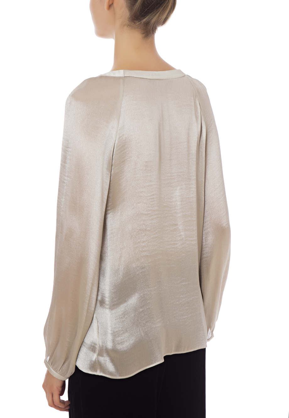 Детали: прямой крой, круглый выреза горловины с мысом и декоративной застёжкой, длинный рукав реглан, собранный тонкой манжетой, от ворота встречные складки.