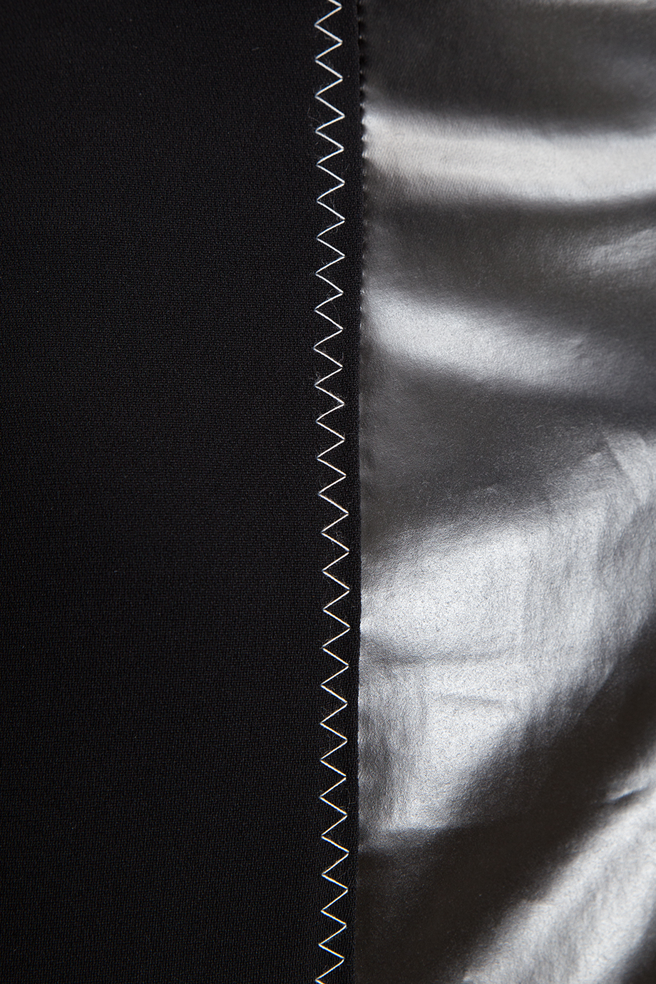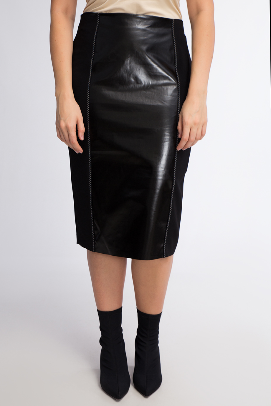 Детали: облегающий крой, высокая посадка, комбинация винила и джерси, контрастные перестрочки, шлица сзади, длина ниже колена.