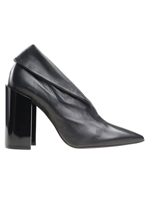 Детали: заострённый носок, гладкая кожа, полукруглый устойчивый каблук высотой 10 см, отворот по линии выреза.