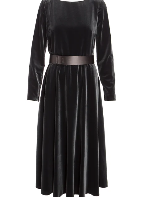 Детали: А-силуэт, вырез горловины лодочкой с глубоким мысом и прозрачной сеткой на спинке, длинный втачной рукав, юбка с обильными складками, кожаный пояс по линии талии, длина миди.