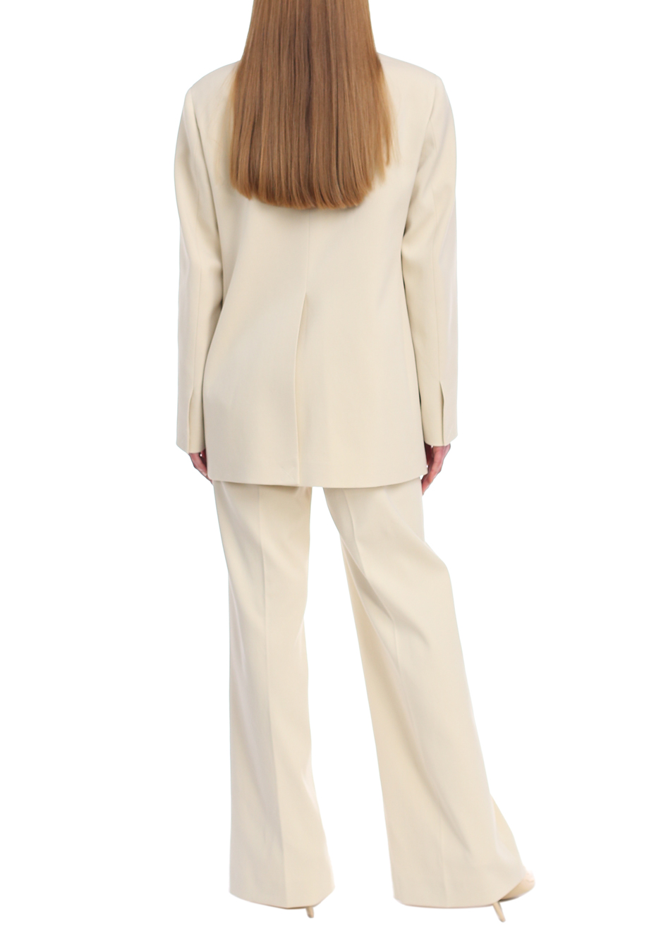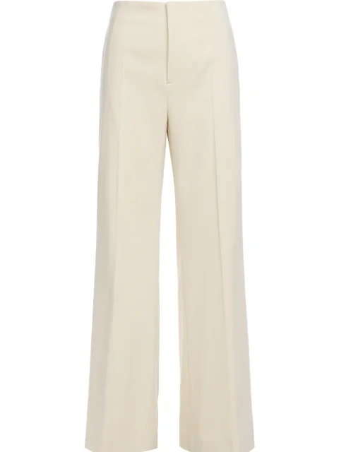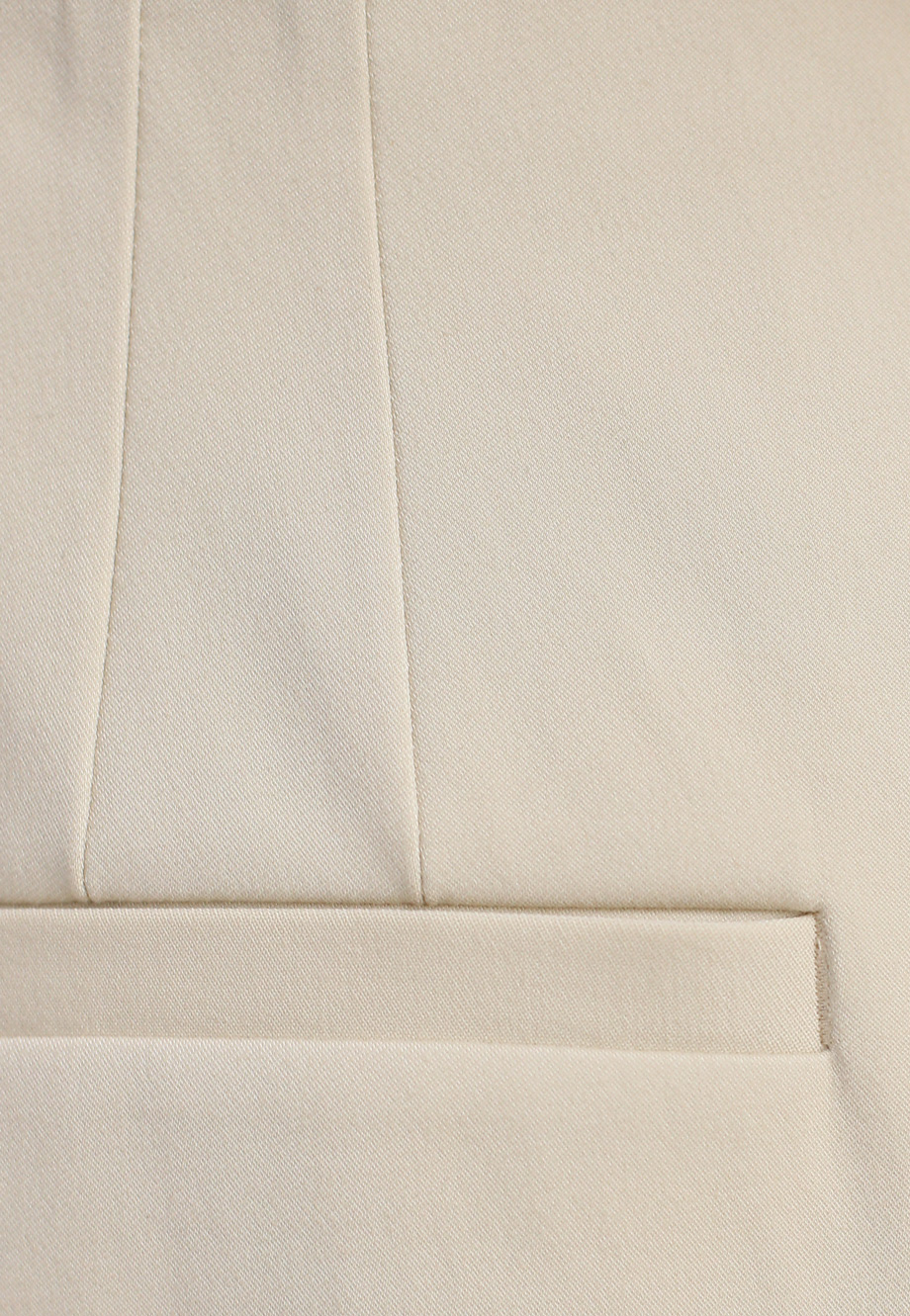 Детали: прямой свободный от бедра крой, высокая посадка, скрытый пояс, прорезные карманы по боковым швам и сзади с рантом. Стрелки вдоль штанин.