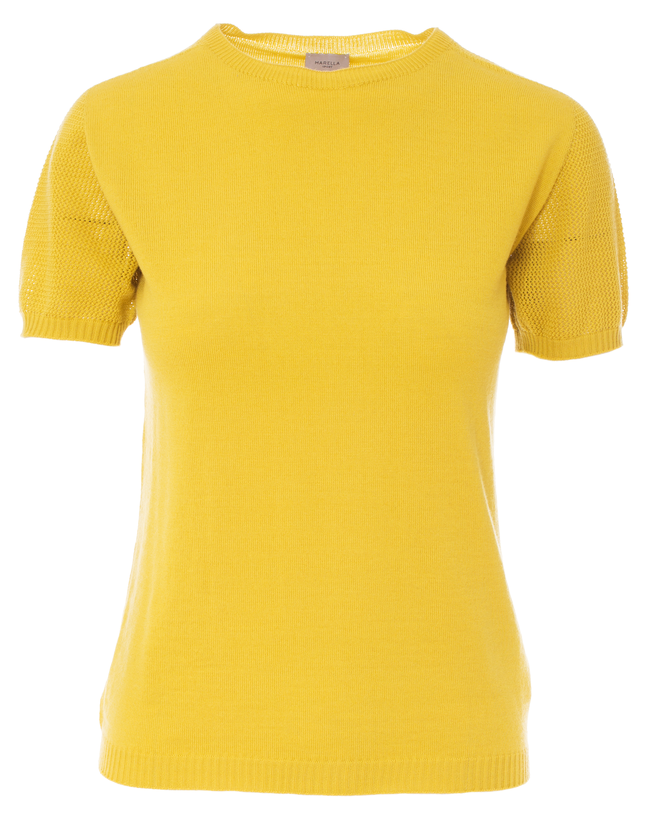 Детали: прямой крой, круглый вырез горловины, короткий рукав с узорчатой вязкой, манжеты по нижнему краю, рукаву и горловине.