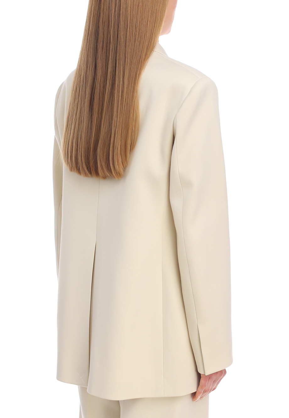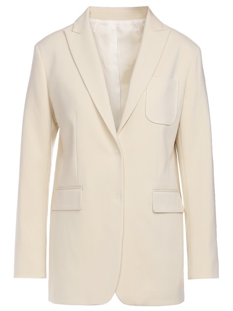 Детали: прямой крой, отложной воротник с лацканами, длинный втачной рукав, нагрудный карман, два прорезных с клапаном по бокам. Застёгивается скрытыми приливными кнопками.