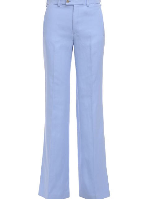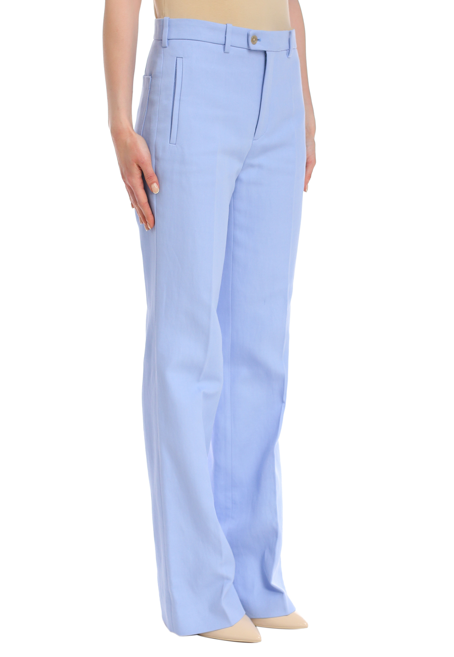 Детали: прямой крой, высокая посадка, прорезные карманы-листочки по бокам, сзади один накладной, стрелки вдоль штанин.