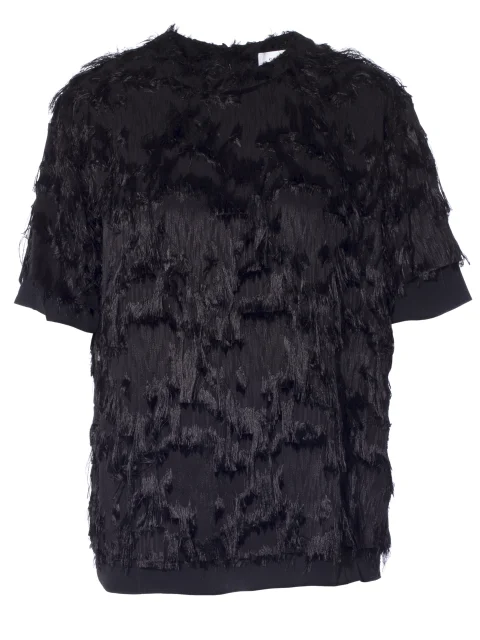 Детали: прямой крой, круглый вырез горловины, короткий рукав с манжетом, двухслойная. Верхний слой с узором из бахромы, нижний – в тон, гладкий. Застегивается потайной молнией на спинке.