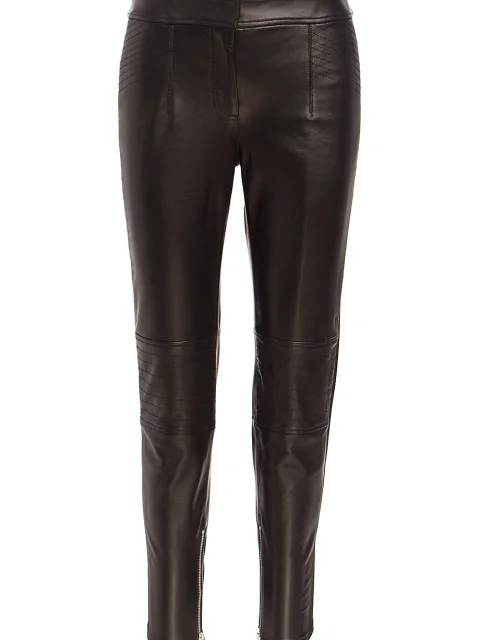 Детали: прямой крой, зауженный книзу, средняя посадка, сзади два прорезных кармана с рантом, перестрочки по бокам и на коленях, молнии по внутренним боковым швам внизу.