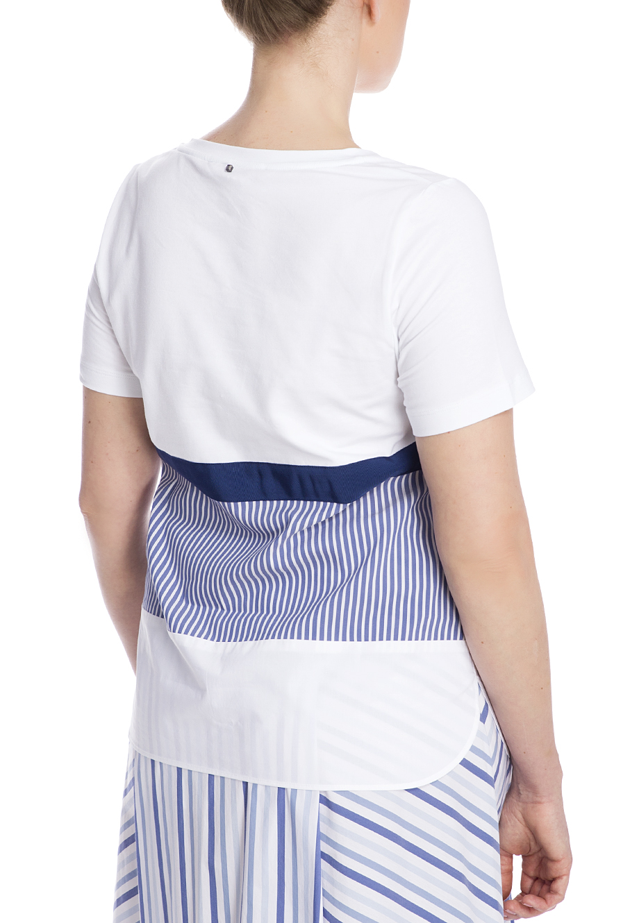 Детали: прямой свободный крой, круглый вырез горловины, короткий втачной рукав, цветные вставки из контрастных материалов.