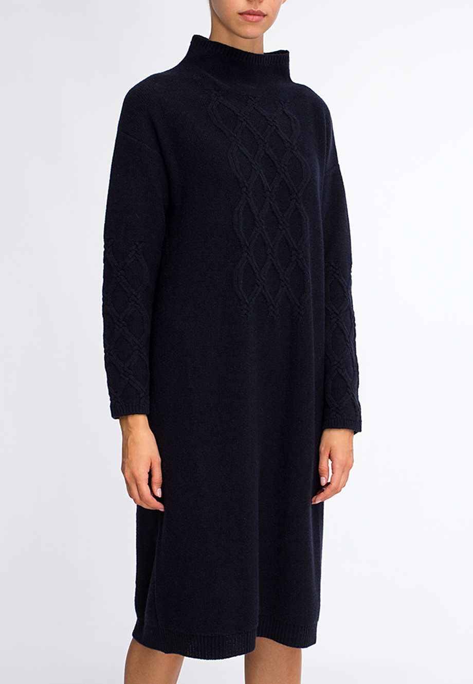 Детали: прямой крой, высокий ворот, спущенный длинный рукав, манжеты по нижнему краю и на рукавах, вязаный узор, длина ниже колена.
