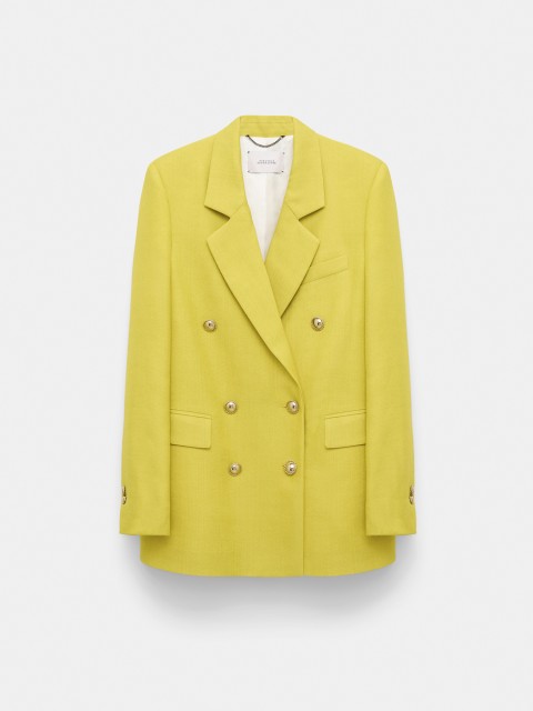 Спортивний і крутий look стилісти Dorothee Schumacher пропонують скласти з насиченої жовтої куртки з капюшоном у стилі анорак і спортивних білих штанів. Нейлонова жовта оверсайз куртка — ідеальний верхній одяг на весну. Поліамід найкраще підходить для міжсезоння, адже захищає від вологи. Зверніть увагу на цікаву деталь цієї речі — накладна кишеня з клапаном ззаду.