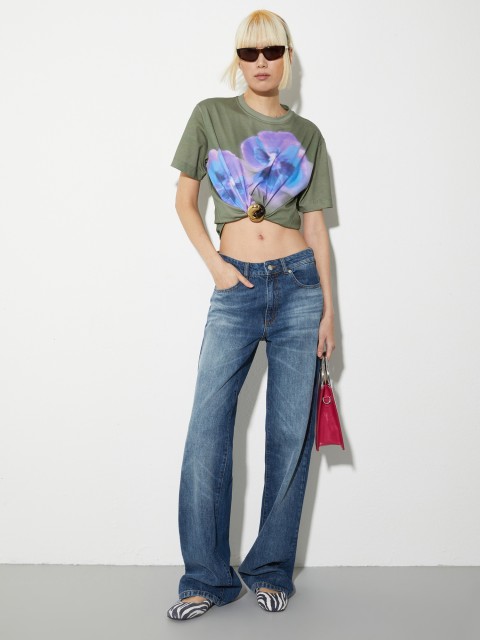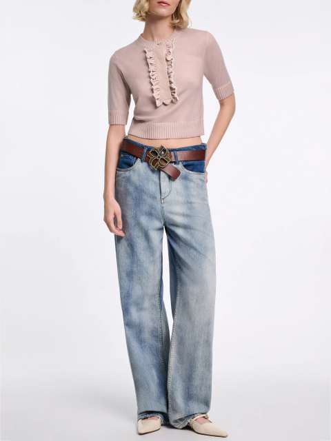 Суперширокі джинси рекомендуємо поєднувати з приталеним верхом для збереження пропорцій. Це може бути топ, водолазка або лонгслів.