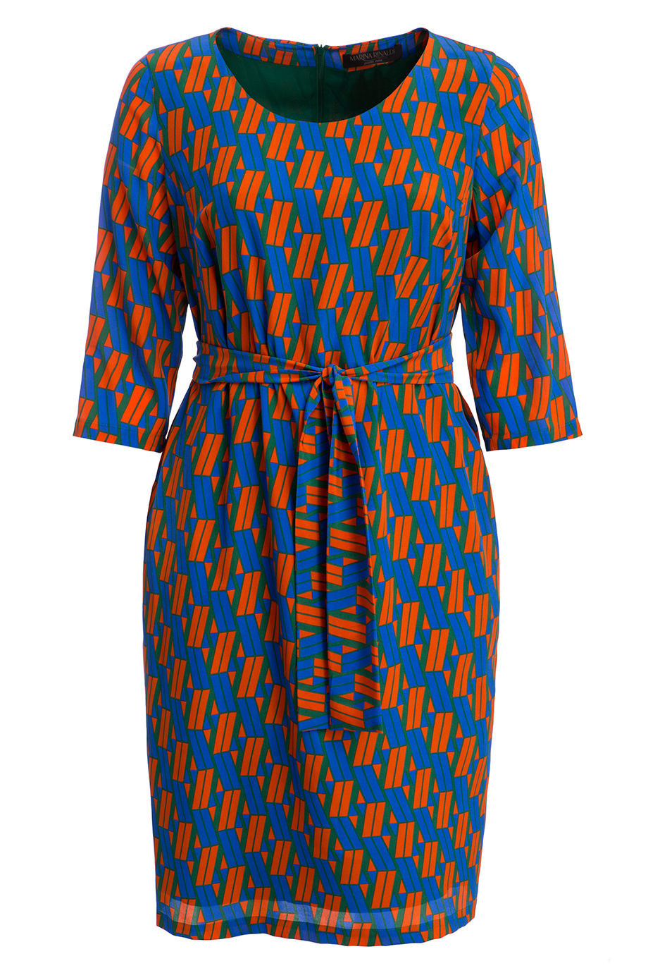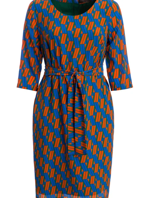 Детали: прямой крой под пояс, круглый вырез горловины, втачной рукав длиной ¾, пояс по линии талии, длина ниже колена, на спинке шлица.