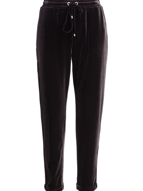 Детали: прямой крой, слегка зауженный книзу, средняя посадка, пояс на кулиске с резинкой и шнурком, прорезные карманы по боковым швам.