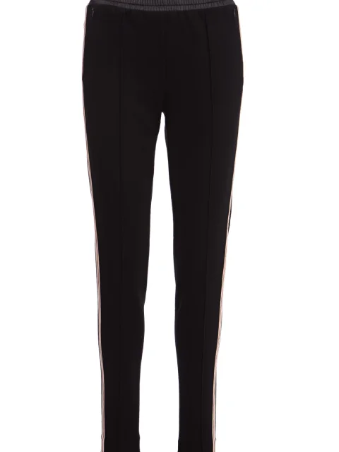 Детали: прямой крой, слегка зауженный книзу, средняя посадка, пояс на кулиске с резинкой, прорезные карманы-листочки с потайными молниями, лампасы по боковым швам, простроченные стрелки вдоль штанин.